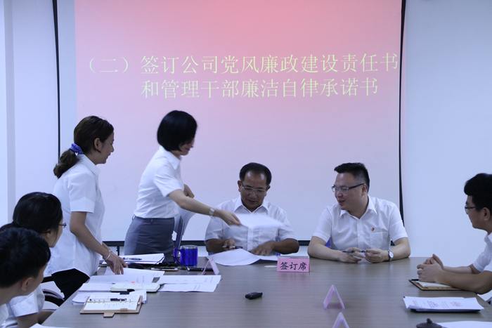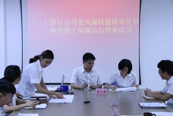 隨后,會議組織簽訂公司黨風廉政建設責任書和管理干部廉潔自律承諾書,由公司總經理李彭年分別和公司副總經理陳洪喜、溫巍靈簽訂黨風廉政建設責任書;公司管理層與中層干部分別簽訂了管理干部廉潔自律承諾書;各部門負責人分別與工程項目負責人、現(xiàn)場主管以及各部門關鍵崗位從業(yè)人員簽訂廉潔自律承諾書。