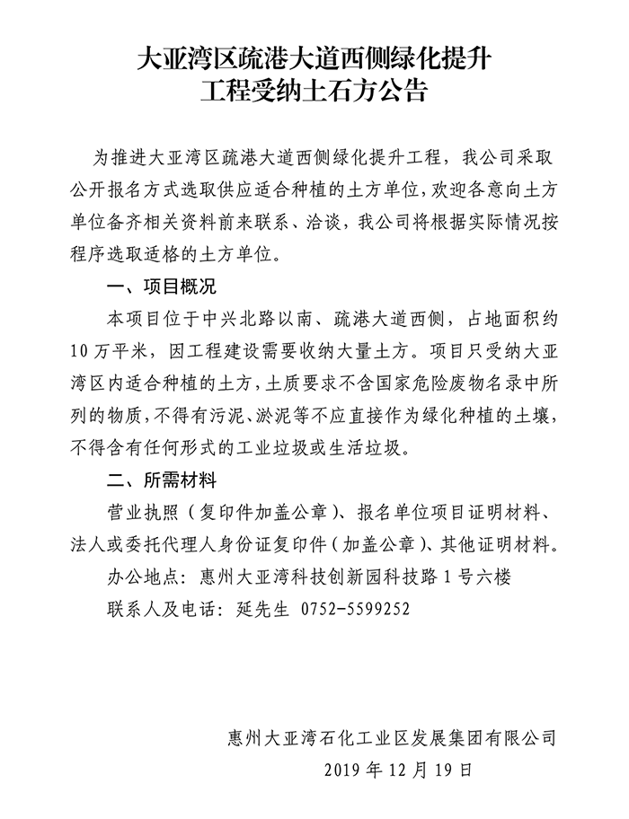 大亞灣區(qū)疏港大道西側(cè)綠化提升工程受納土石方公告