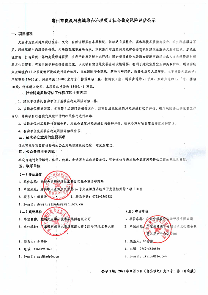 惠州市淡澳河流域綜合治理項目社會穩定風險評估公示(公示稿)