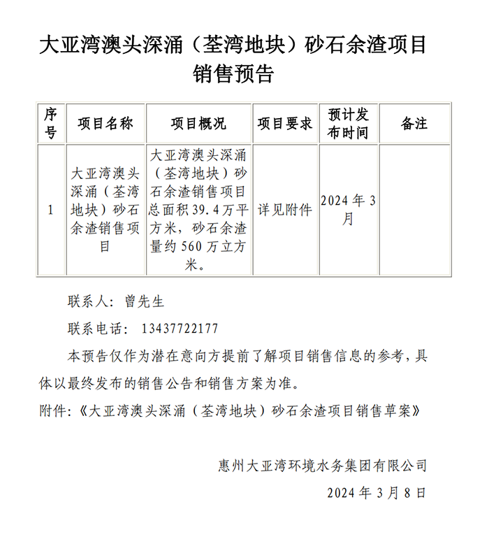 大亞灣澳頭深涌(荃灣地塊)砂石余渣項目銷售預(yù)告